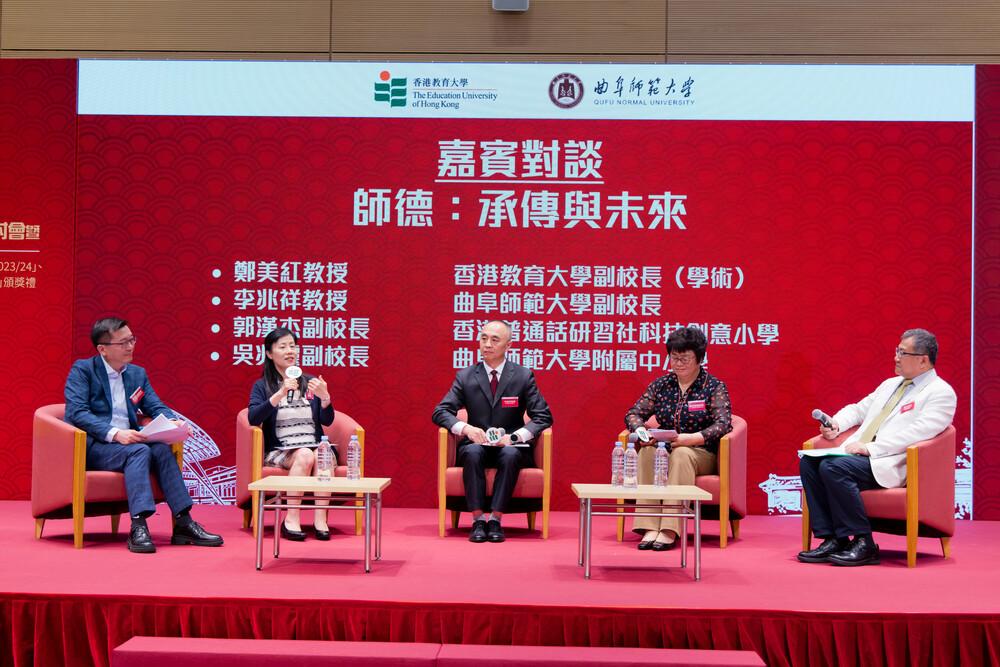 在周立先生主持的對談環節中,鄭美紅教授、李兆祥教授、香港普通話研習社科技創意小學副校長郭漢杰先生及曲阜師範大學附屬中小學副校長吳兆靈女士,圍繞「師德:承傳與未來」主題交流。他們從師德教育的核心價值、實踐策略及未來挑戰等多個角度探討新時代教師的使命,以及如何將傳統師道精神融入現代教育的實踐方法。